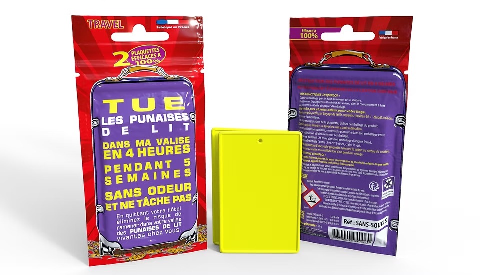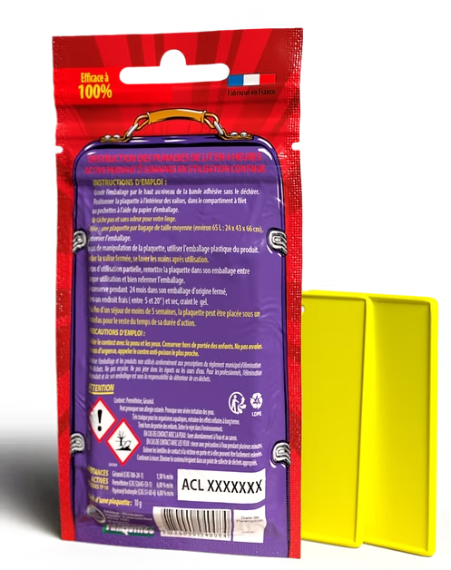 Les punaises de lit peuvent se cacher dans les habits, les doublures, les divers coins des valises. À la fin de votre séjour, la plaquette Tranquilleo après les 4 heures de diffusion vous permettra de ranger vos valises en toute sécurité.